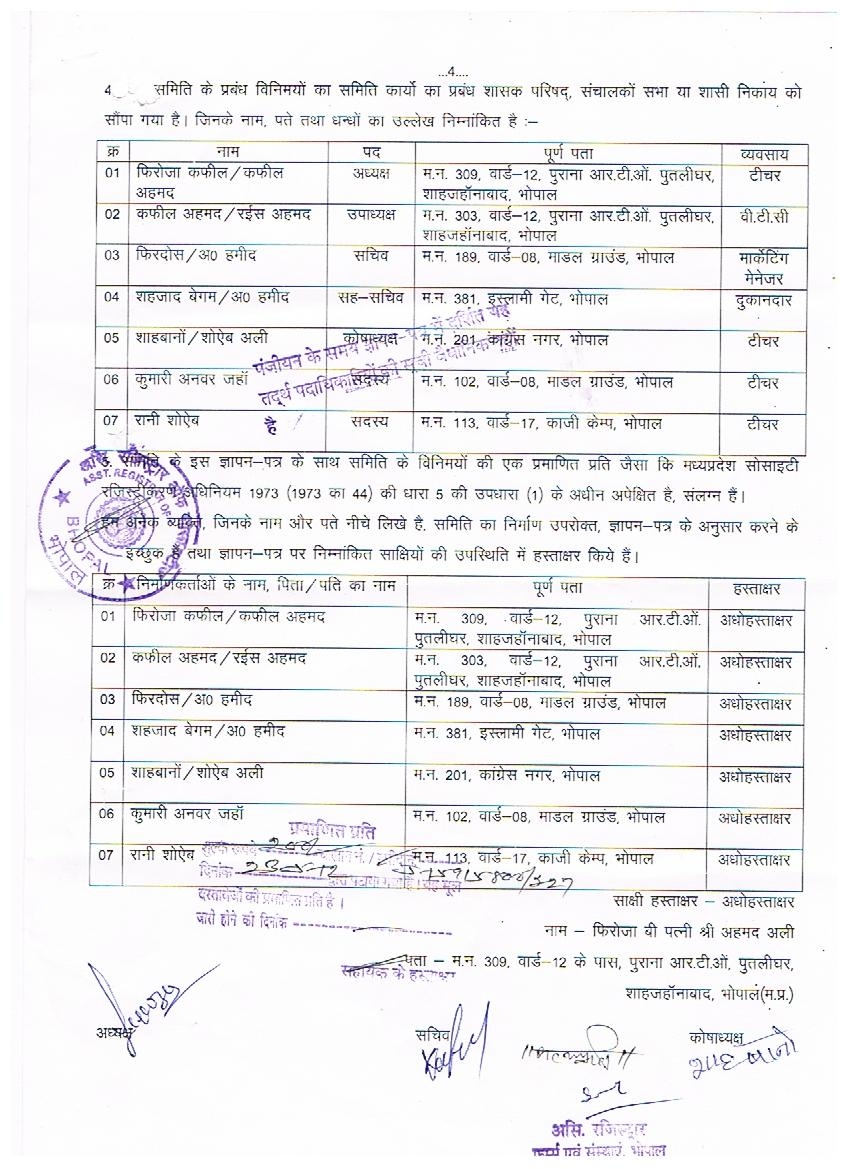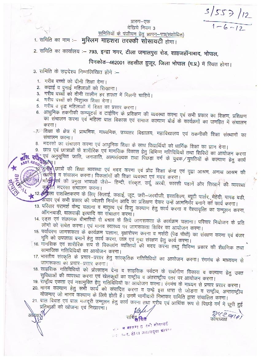 Muslim Maashra Taraqqi Society is a registered NGO from the Bhopal Registration Firm and Society.